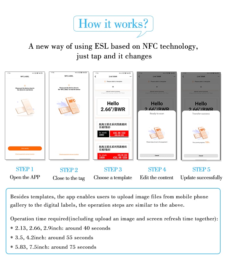 Bu, cep telefonu NFC ile yenilenebilen bir dijital etikettir. Perakende, ofis, kamusal alanlar vb. dahil olmak üzere daha fazla uygulama senaryosuna epaper ekranlarının girişini hızlandırır.